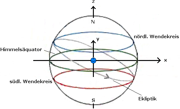 Den Radius der Himmelskugel setzt man der Einfachheit halber gleich 1 . Auf ihr kann man die Positionen der Fixsterne markieren, so wie sie von der Erde aus gesehen werden. Die Ekliptik ist die jährliche Sonnenbahn. Die Breitenkreise am nördlichsten und südlichsten Punkt der Sonnenbahn sind der nördliche bzw. südliche Wendekreis auf der Himmelskugel. Man legt ein kartesisches Koordinatensystem in diese Himmelsdarstellung, dessen x-y-Ebene die Äquatorebene ist und dessen z-Achse durch die Pole verläuft; in Bild 1 stehen N und S für den Nord- bzw. Südpol. Wir legen die x- und die y-Achse so, dass der Tiefpunkt der Ekliptik unter der positiven Richtung der x-Achse liegt (dann ist y = 0 ). Die Schnittpunkte der Ekliptik mit dem Äquator liegen dann bei y = ±1 und x = 0 .