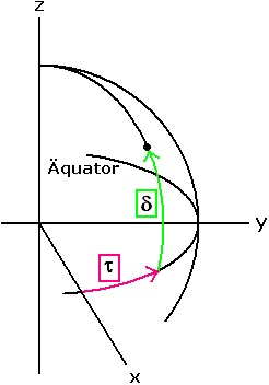 Was bedeuten die so berechneten Koordinaten (δ, τ)? δ ist der Kippwinkel, aber gegenüber Bild 8 ist die Projektion des Großhalbkreises (hier: Längenhalbkreis) um τ im Gegenuhrzeigersinn gedreht. Aus den Koordinaten unter Bild 8 wird somit: