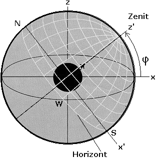 Für das Astrolabium wird noch ein weiteres Koordinatensystem benötigt, das Horizontalsystem, das am Beobachter auf der Erde orientiert ist. Der Beobachter sieht nur eine Hälfte der Himmelskugel und gibt die Position von Sonne und Sternen ebenfalls in Breite und Länge an, aber bezogen auf seinen eigenen Horizont. Zur Veranschaulichung legt man das Netz der horizontalen Koordinaten über das in Bild 1 skizzierte Himmelsmodell. Dies sieht man in Bild 3; der dort eingezeichnete Winkel φ ist die irdische geographische Breite des Beobachters. Da Astrolabien nur für die nördliche Hemisphäre gebaut wurden, wird hier nur φ ∈ (0, π/2) = (0°, 90°) betrachtet.