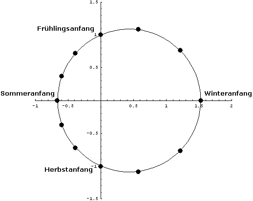 Setzt man beispielsweise in der Skaleneinteilung k = 12 (zur Markierung der (gerundeten) Monatslängen, beginnend mit dem Winteranfang), sieht man das Ergebnis wie in Bild 7.