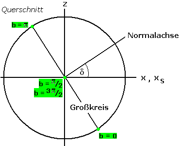 Die wie in Bild 8 dargestellten Großkreise liegen alle mit ihrem tiefsten Punkt unter der x-Achse, und ihre senkrecht zur Großkreisebene stehende "Normalachse" bildet mit der x-Achse den Winkel δ . Mit (7) ergibt sich für den projizierten Großkreis:
