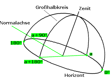 Äquatorialer / horizontaler Großkreis 0° / 180° (Süd-Nord-Halbkreis)