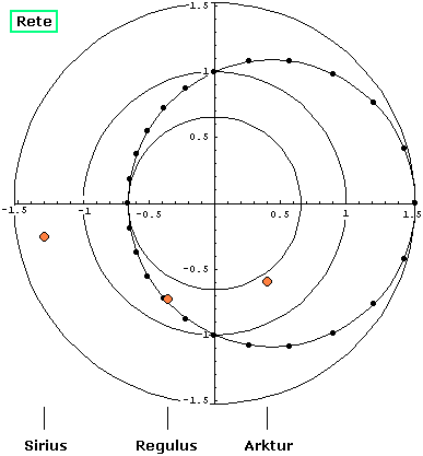 Bild 10 zeigt die wesentlichen Elemente der Rete. Von außen nach innen sind die konzentrischen Kreise für den südlichen Wendekreis, den Himmelsäquator und den nördlichen Wendekreis eingezeichnet. Nach rechts versetzt ist der Kreis für die Ekliptik mit einer Halbmonatsskala (vgl. Bild 7). Eine Rete enthält meist zahlreiche Sterne; hier wurden beispielhaft drei von ihnen eingezeichnet.