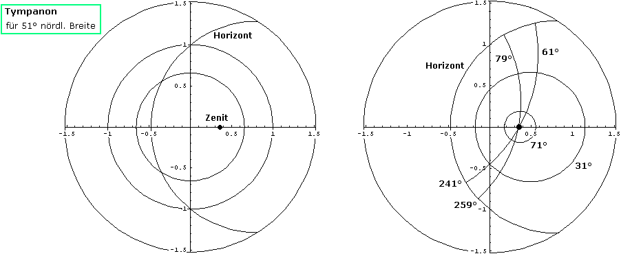 Bild 11 zeigt die Konstruktion des Tympanons in zwei Schritten. Links sind für 51° nördlicher Breite Horizont und Zenit über die Wendekreise und den Äquator gelegt worden. Rechts wurden nördlicher Wendekreis und Äquator weggelassen, und je zwei Breitenkreise ( 31° und 71° ) und Längenkreise ( 61° / 241° und 79° / 259° , Zählung von Süd über Ost) beispielhaft hinzugefügt. Vervollständigt man die rechte Skizze mit weiteren Breiten- und Längenkreisen und legt man beide Skizzen übereinander, erhält man die Darstellung in Bild 6.