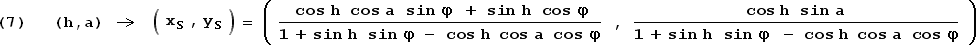 Für die vorletzte Umformung benutzt man die trigonometrischen Formeln für den halben Winkel und die Spiegelung an 90° . So ergibt sich die stereographische Projektion des Äquatorialsystems auf die Äquatorebene ((m,τ) Polarkoordinaten, (xs,ys) kartesische Koordinaten):